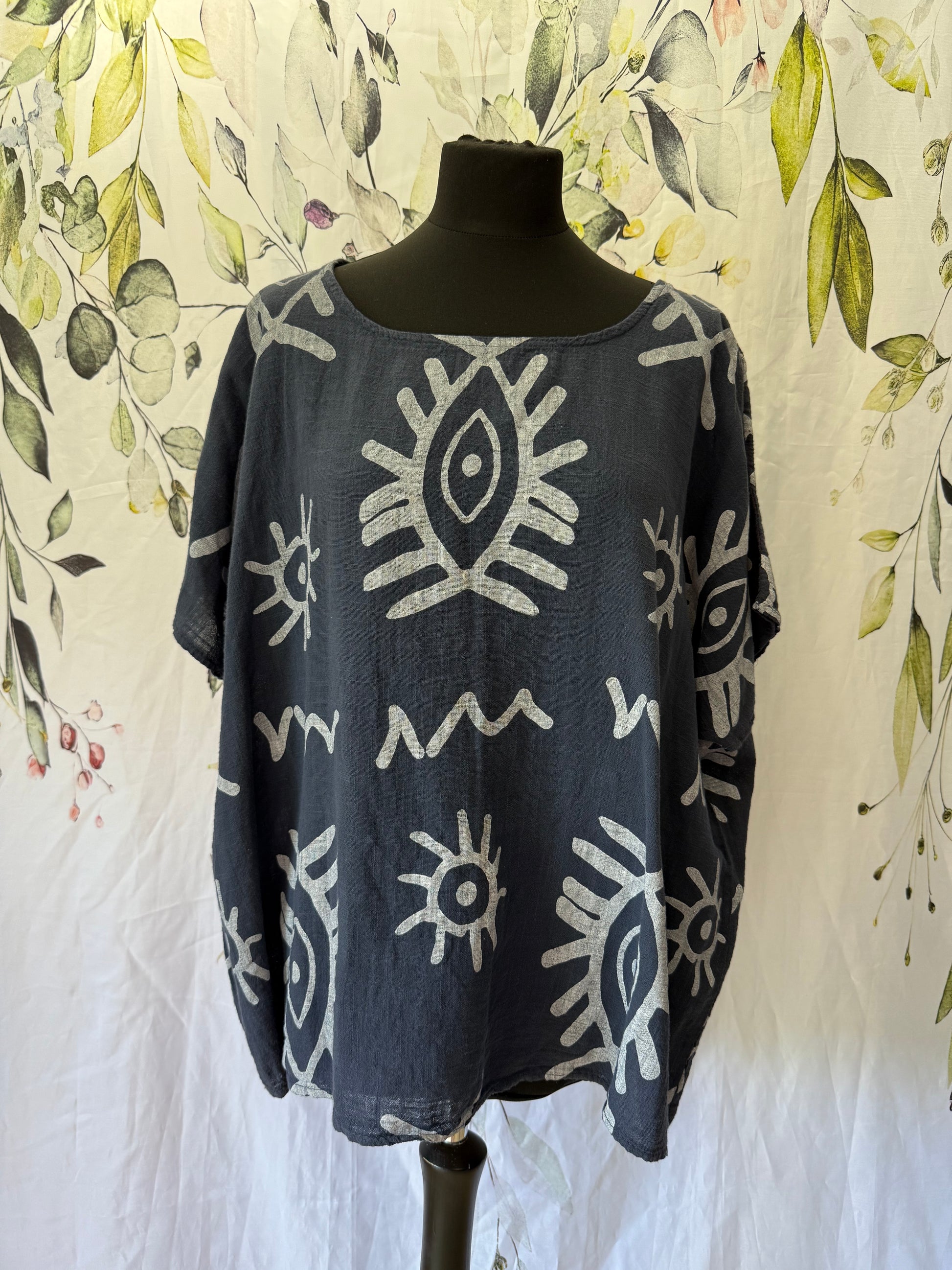 Introducing the Cotton Print Top. With a cool cotton material and an abstract Astec inspired design, this top is perfect for any casual occasion. Stay comfortable and cool with this stylish addition to your wardrobe.