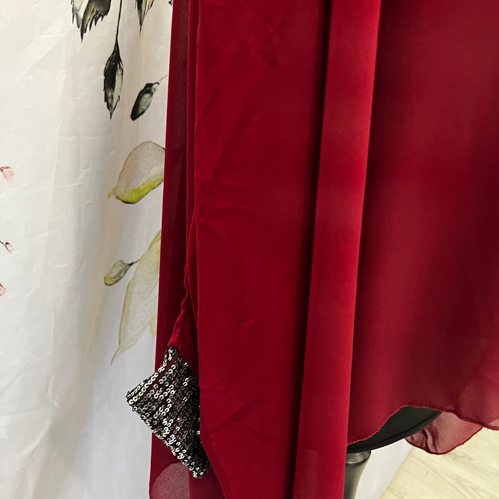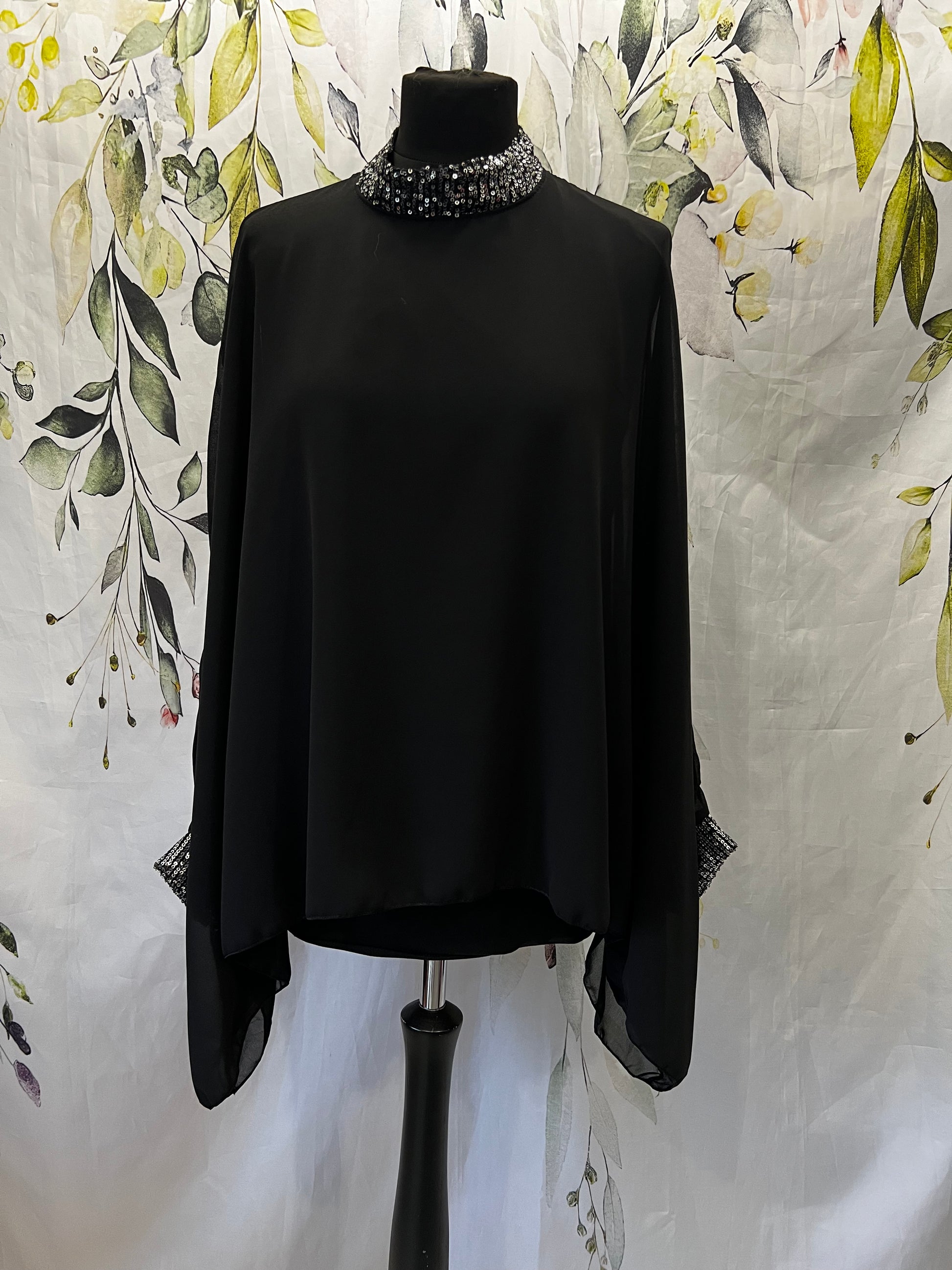Expertly designed for a sophisticated look, our Batwing Top features a sheer floaty fabric with an attached stretch vest for comfort. The stunning sequin collar and cuff detail add a touch of glamour to any outfit. Elevate your style with this must-have piece.