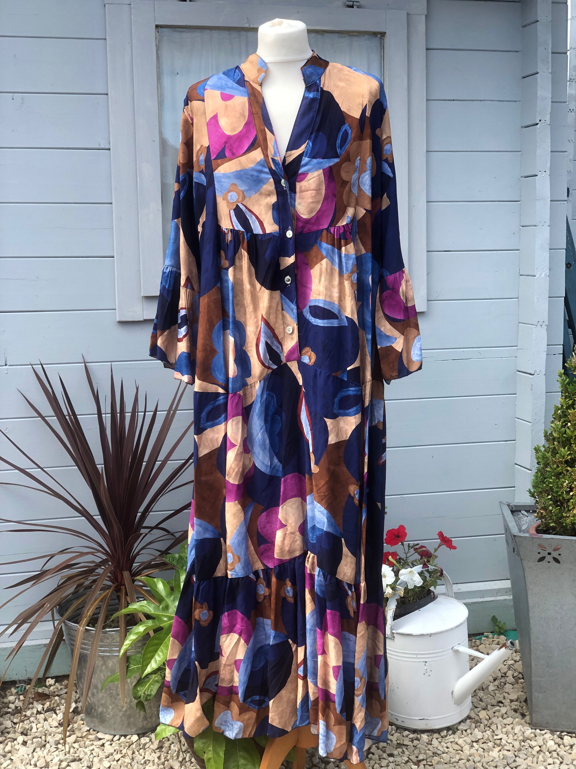 Long dress with boho style print. Buttons to waist and 3/4 length sleeves with frill cuff