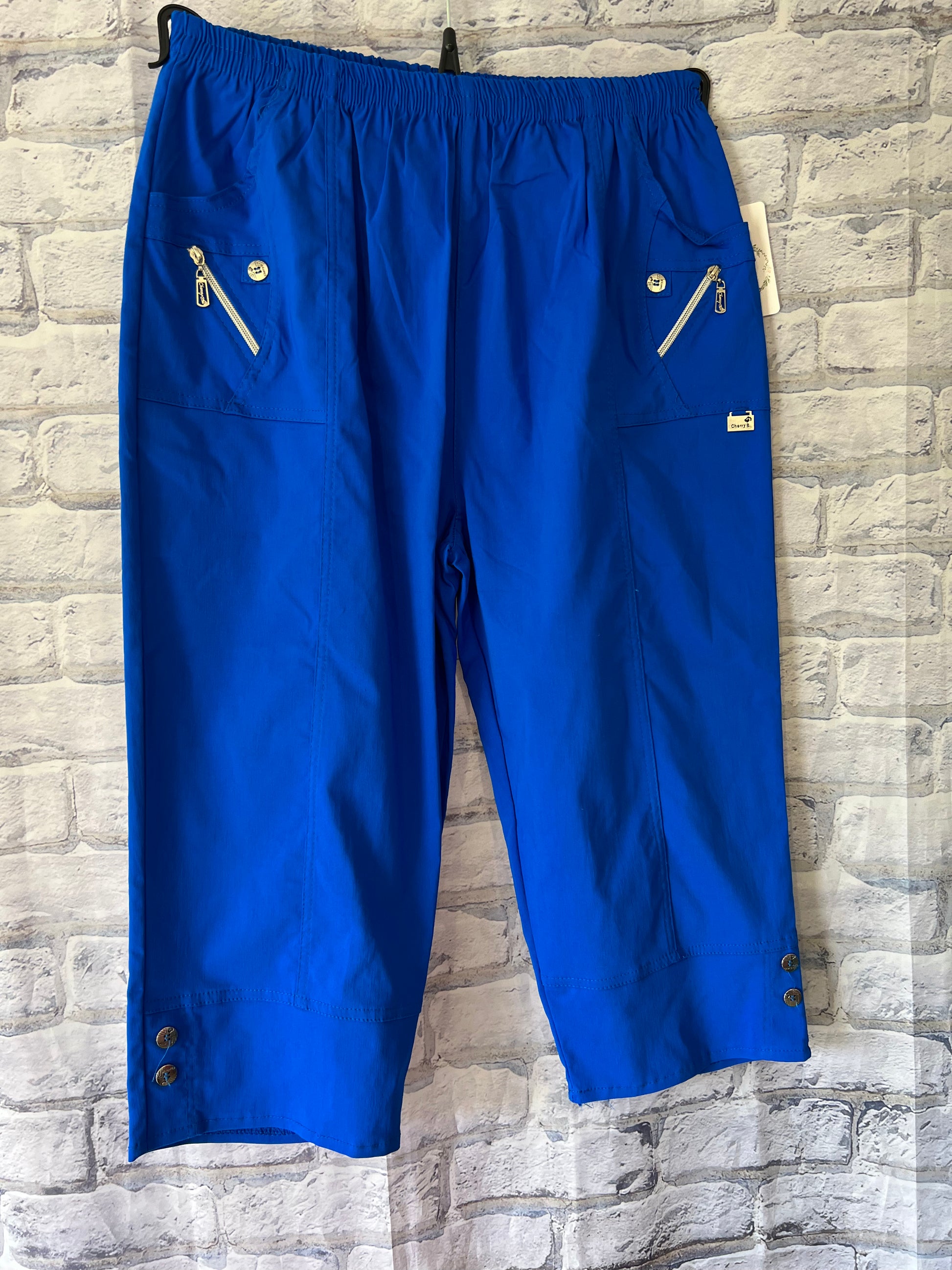 Super stretchy Capri length trousers with side pockets, mock zip and button detail.