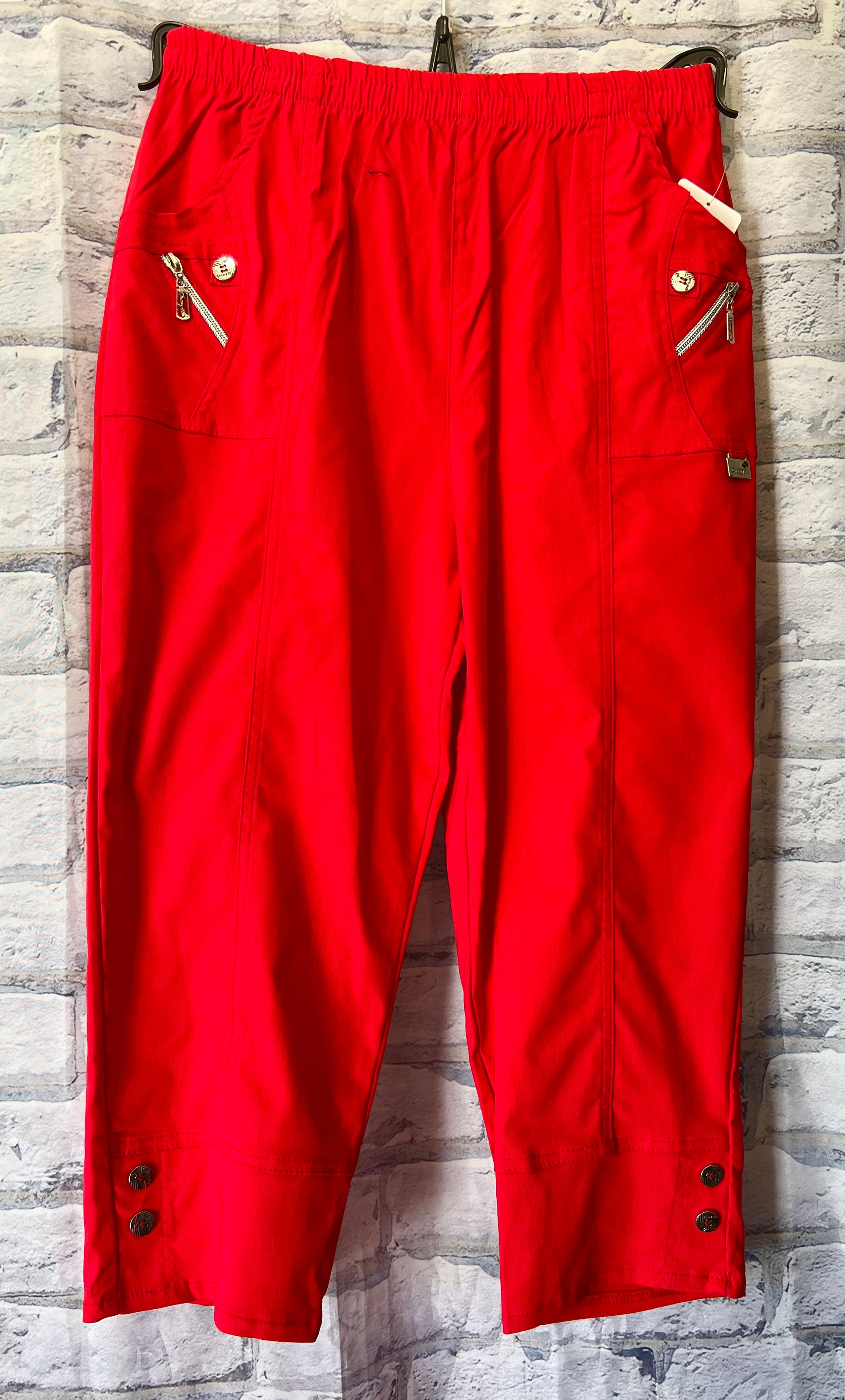 Super stretchy Capri length trousers with side pockets, mock zip and button detail.