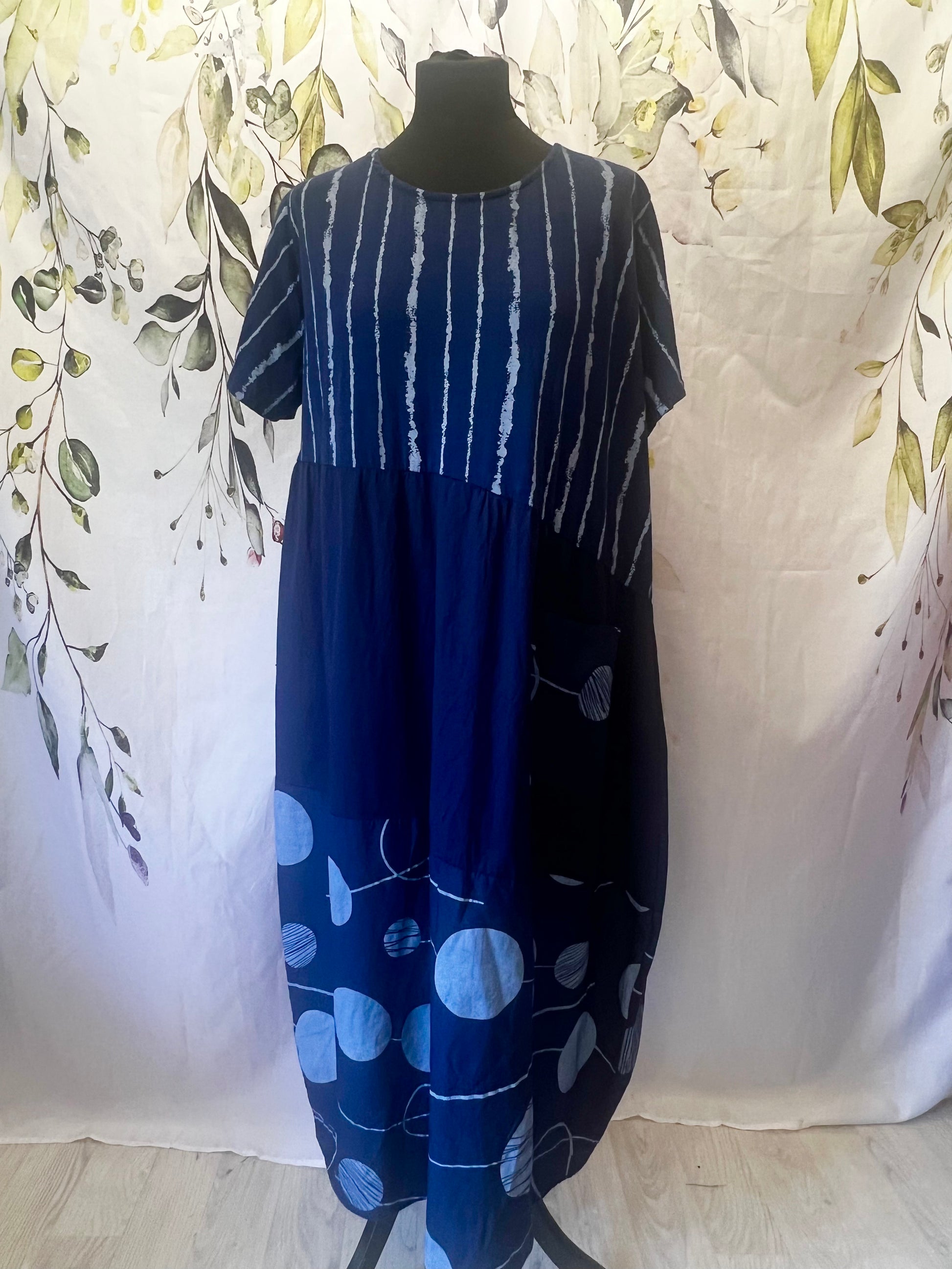 Super comfy cotton dress with spot and stripe panels. Cool cotton with cotton jersey