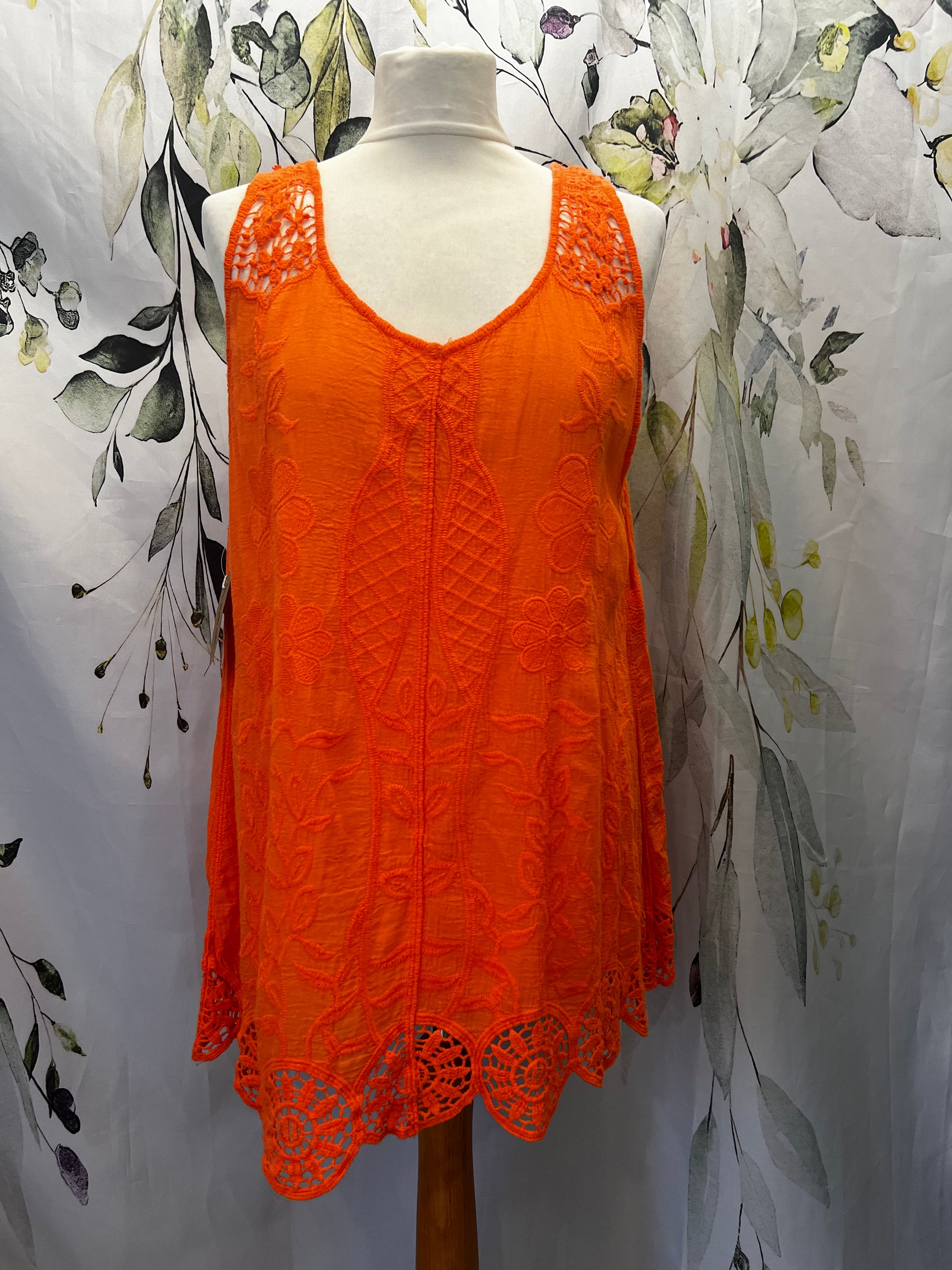 Sleeveless vest style top in super cool cotton. Lace effect straps and hemline.