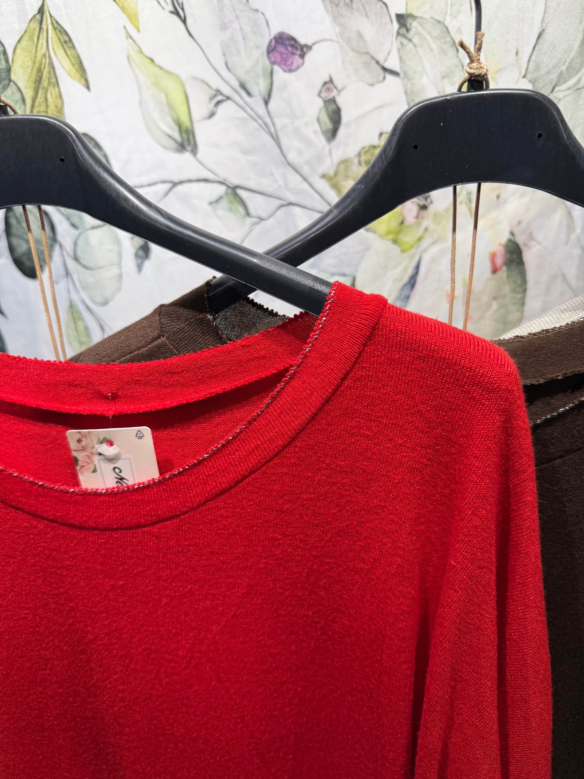 Super soft tunic length knit with subtle shimmer detail to neckline and front seam.