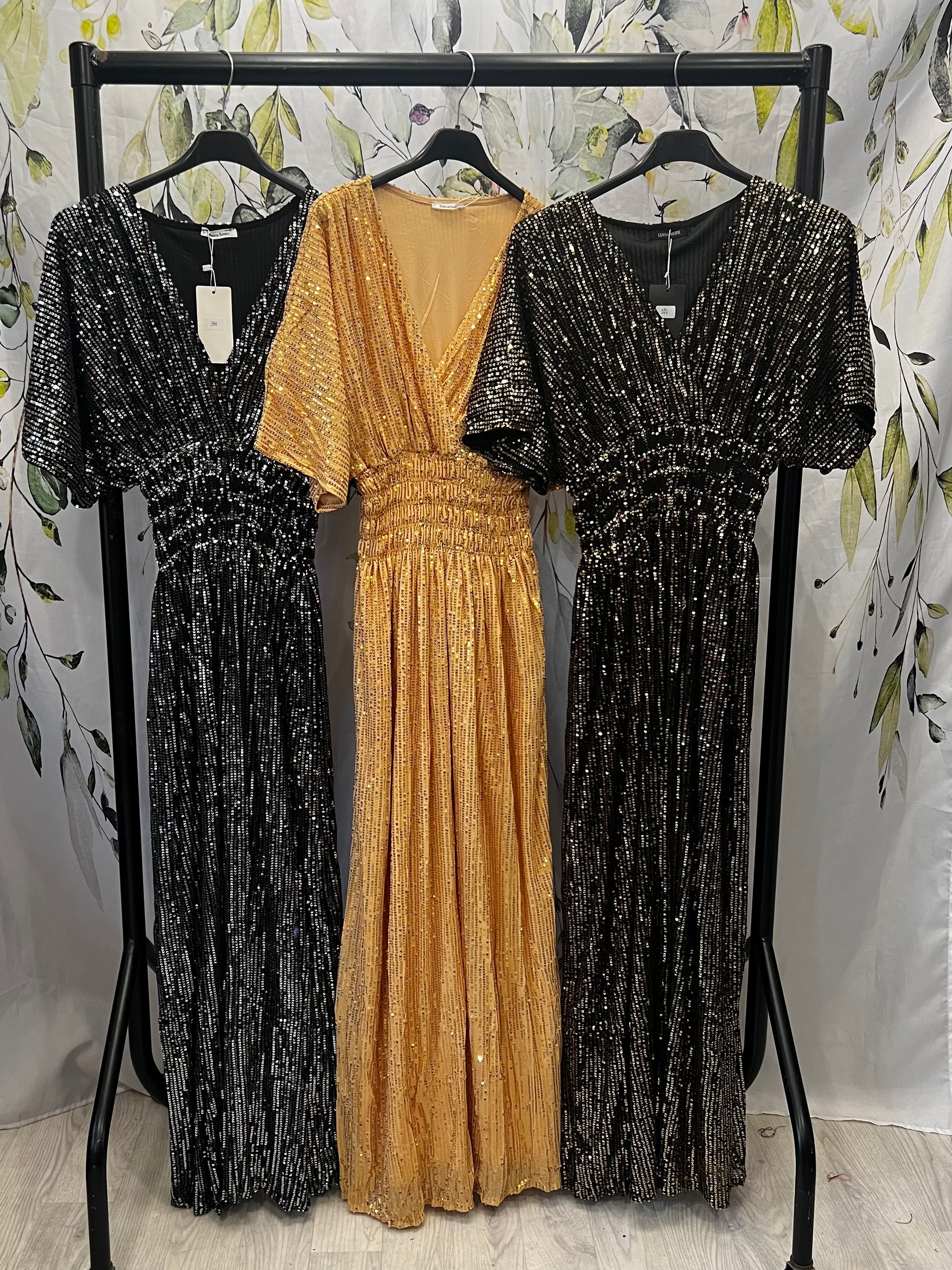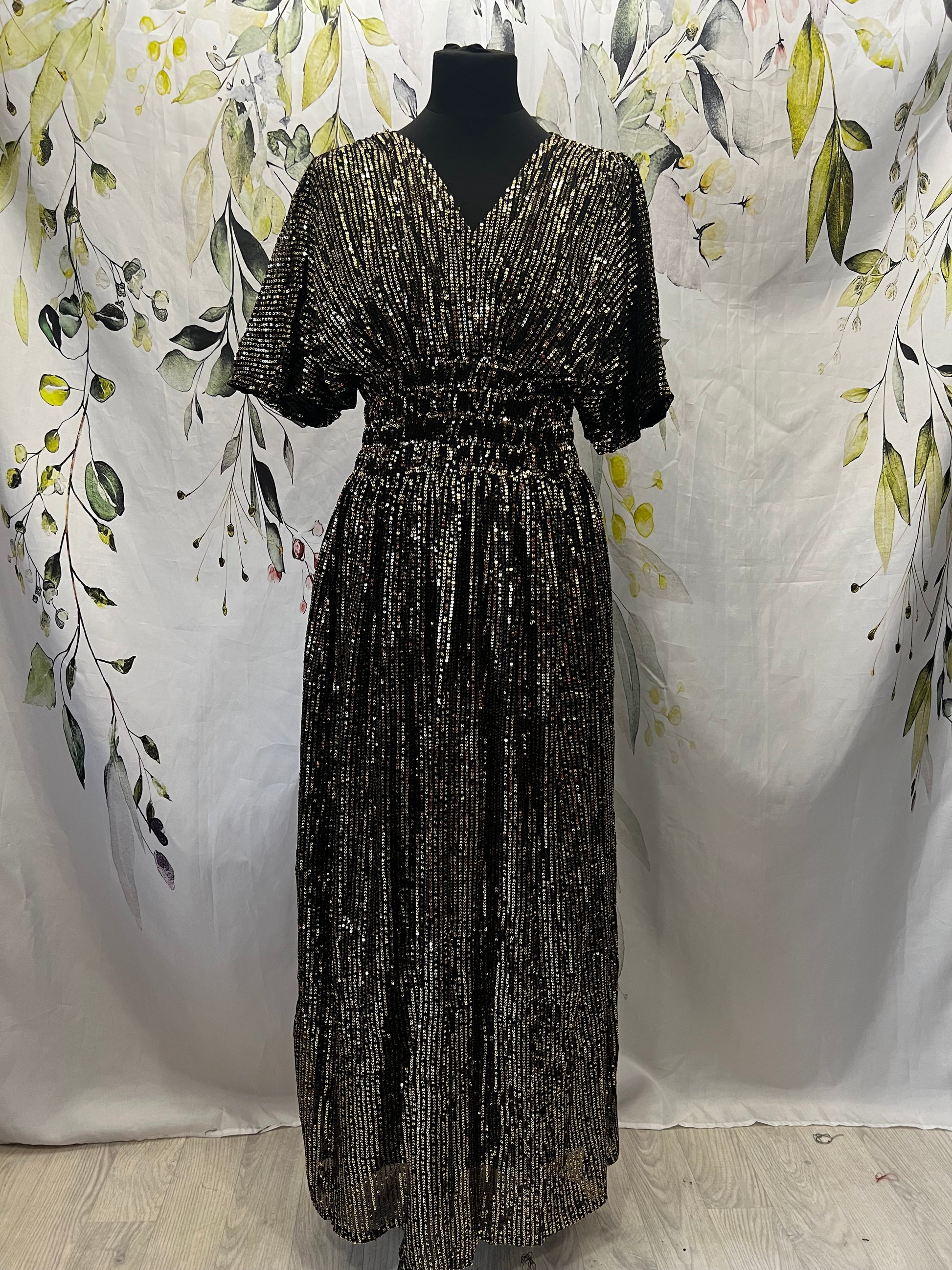 This elegant Maxi Sequin Dress features a glamorous sparkle that is sure to turn heads. Perfect for any formal occasion, the dress boasts a maxi length and elasticated waist for a comfortable and flattering fit. Add a touch of sparkle to your wardrobe with this stunning dress.