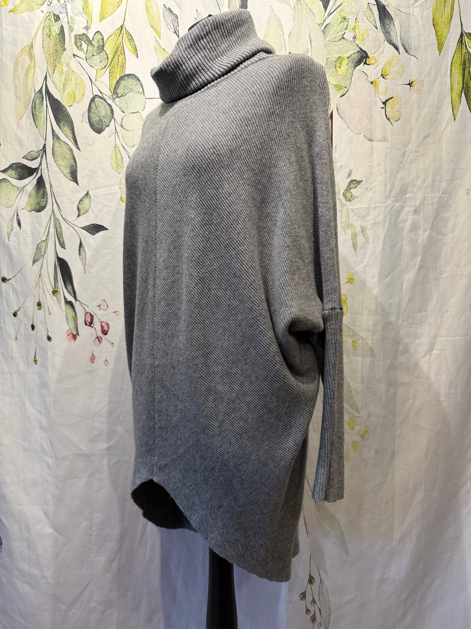 Beautifully soft ribbed knit tunic dress. Loose roll neck and flattering dropped shoulders.